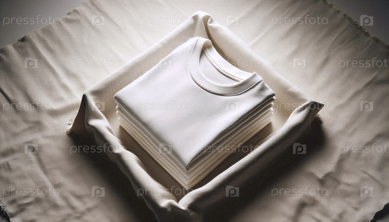 Мокет футболок из чистой белой органической хлопковой ткани, нежно сложенный на холсте из конопли, Ai generated image