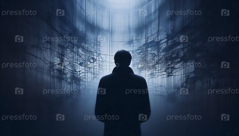 Силуэт в утреннем тумане на абстрактной городской стене, Ай создал изображение