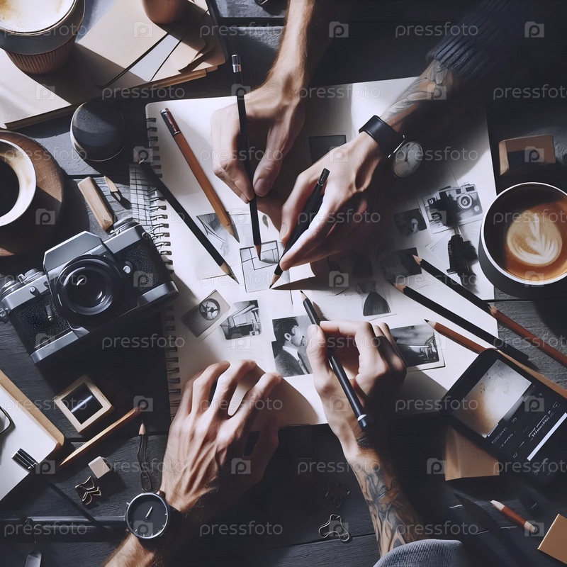 Творческий мозговой штурм, сделанный руками и инструментами на деревянном столе, Ай создал изображение