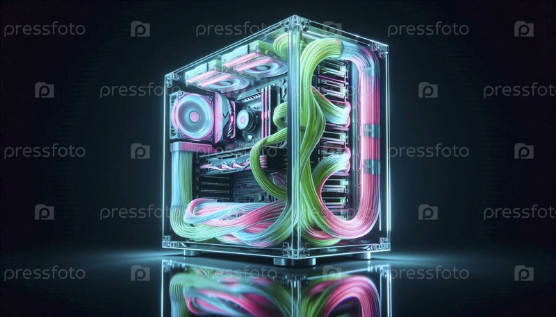 Прозрачный акриловый макет корпуса башни ПК с цветными кабелями внутри, на зеркале создано изображение Ai