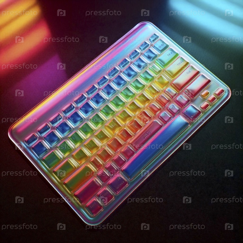 Прозрачный макет кожи клавиатуры с радужным гелем, установленный на стеклянном столе, Ai generated image