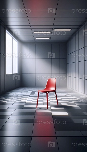 Мокет одного ярко-красного формованного пластикового стула в пустом виртуальном выставочном зале, Ai generated image