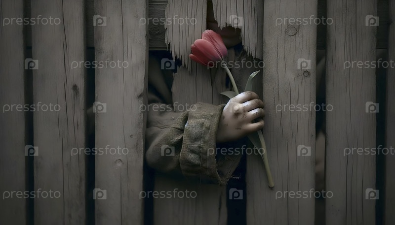 Мальчик переносит тюльпан через сломанный забор, Ai generated image