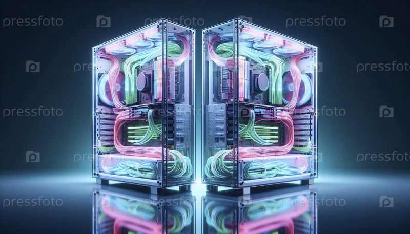 Прозрачный акриловый макет корпуса башни ПК с цветными кабелями внутри, на зеркале создано изображение Ai