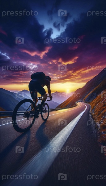 Приключенческий велосипедист покоряет извилистую горную дорогу на закате, оглядываясь назад, Ai generated image