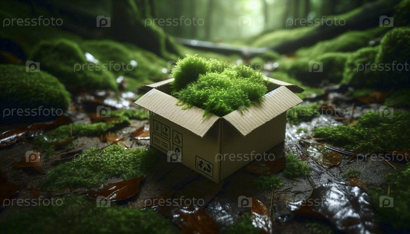 Простой макет картонной коробки с живым мхом, растущим естественным образом в одном из его влажных уголков, в затененной лесной обстановке, Ai создал образ