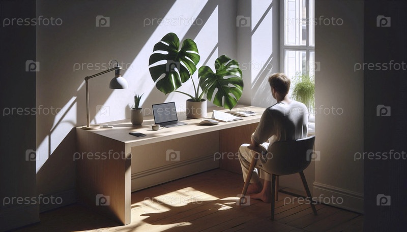 Удаленный работник находит фокус в минималистичном, солнечном углу домашнего офиса, Ai generated image