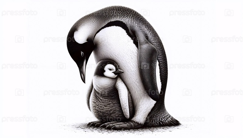 Пингвинский цыпленок со своим родителем чернила рисование художественная печать, Ai generated image