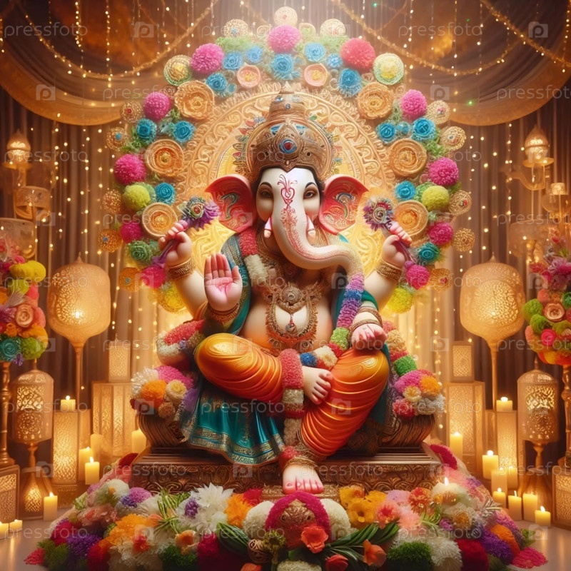 Господь Ганеша с цветочными венками, Ai generated image