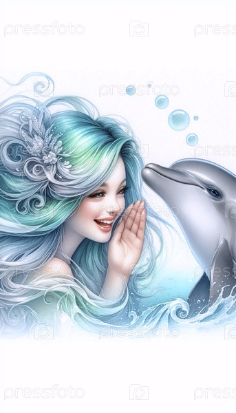 Русалка делится секретом с акварельной печатью дельфина, Ai generated image