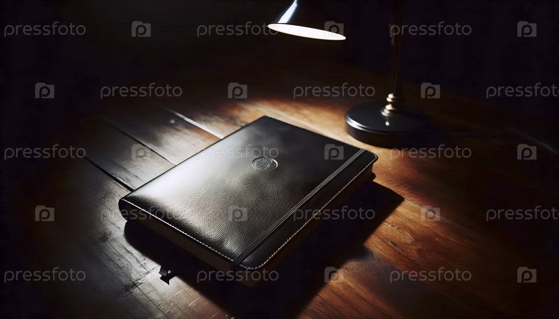 Мокет черного кожаного ноутбука с логотипом слепых, на темном ореховом столе, Ai generated image