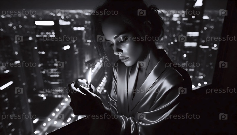 Женщина зажигает сигарету на балконе небоскреба, Ai generated image
