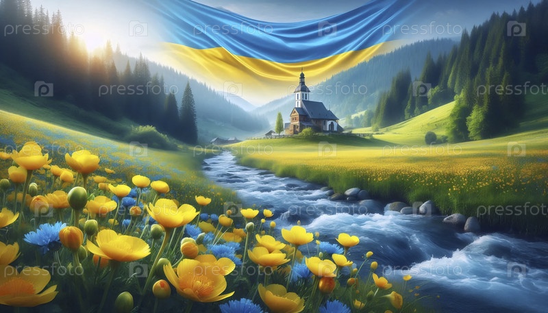Украинский флаг в Карпатских горных лугах, Ai generated image