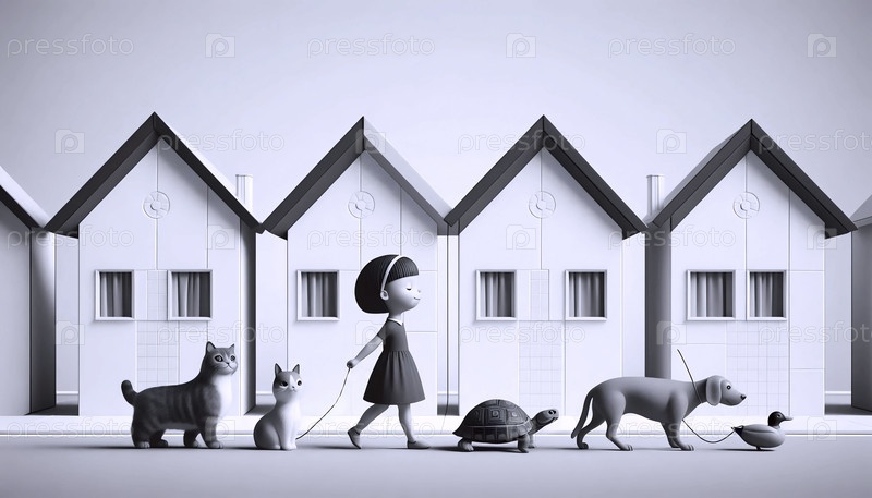 Иллюстрация середины века ребенка, ведущего шествие животных, Ai generated image