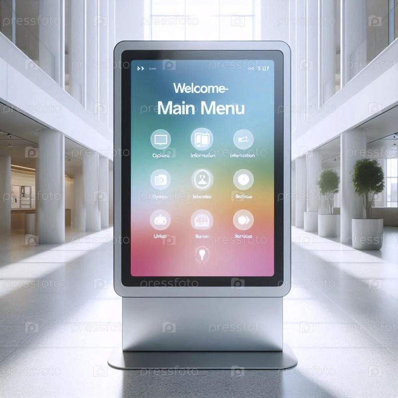 Макет общественного киоска с сенсорным экраном в ярком лобби, отображающий чистое главное меню с пустыми кнопками, Ai generated image