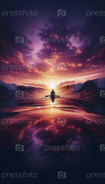 Одинокий серфер гребёт на закате, силуэт против огненного отражающегося океана, Ai generated image