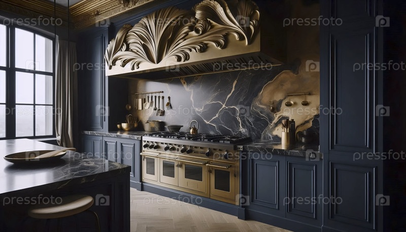 Голубая кухня из графита с дубовыми открытыми полками, Ai generated image