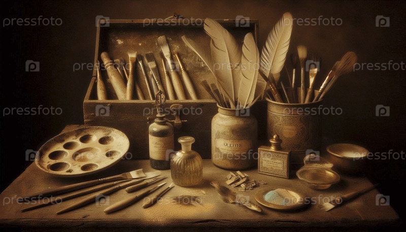 Таблица для одежды ангелов: белая краска, золотая пыль, флакон забвения, Ai generated image
