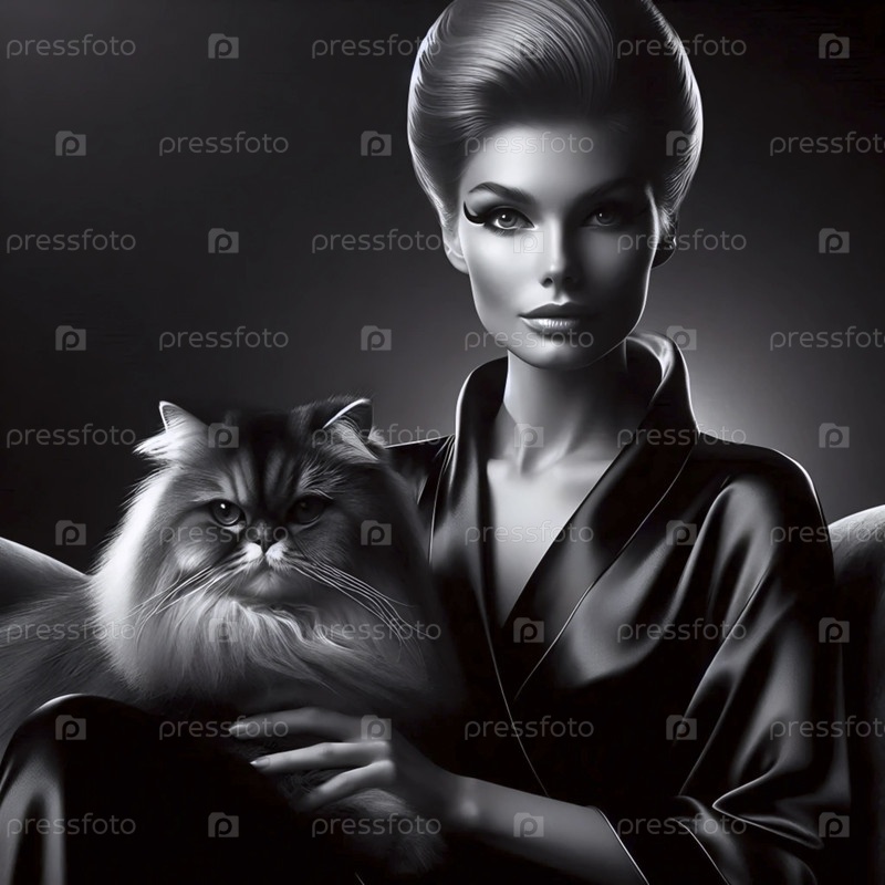 Гламурный портрет женщины со своей кошкой, Ai generated image
