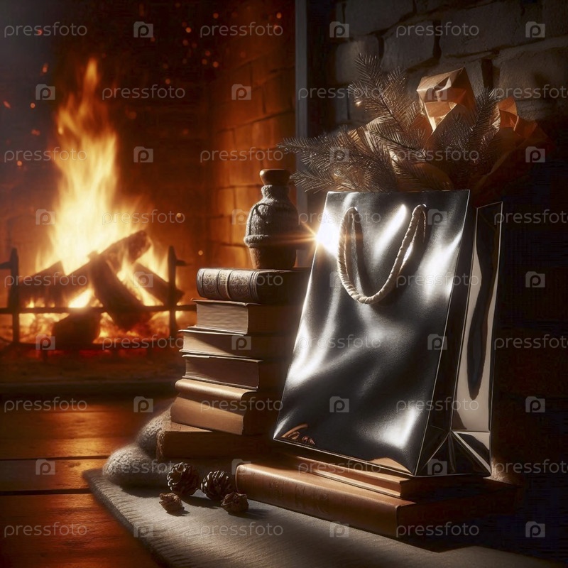 Мокет глянцевой серебряной подарочной сумки, опираясь на кучу старинных книг у трескающегося камина, Ai generated image