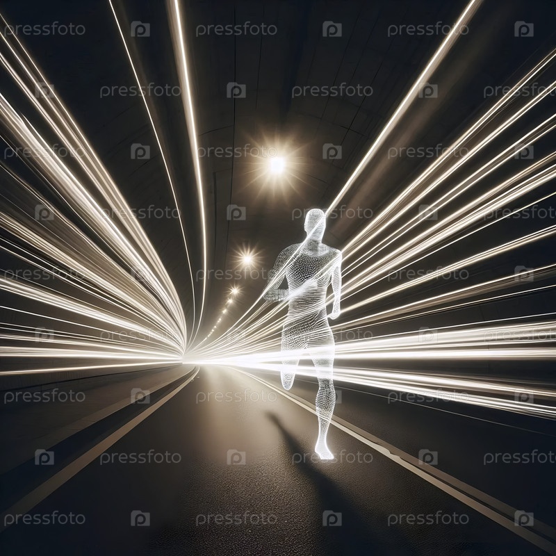 Фотография с длительной экспозицией фигуры, проходящей через туннель света, Ai создала изображение