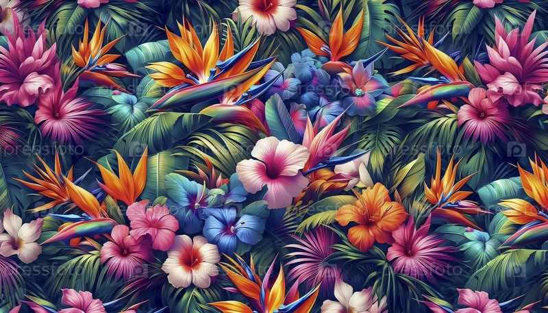 Яркий тропический экзотический цветочный бесшовный образец, Ai generated image