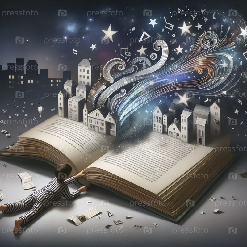 Мечтательная иллюстрация ребенка, летящего на книге, Ai generated image
