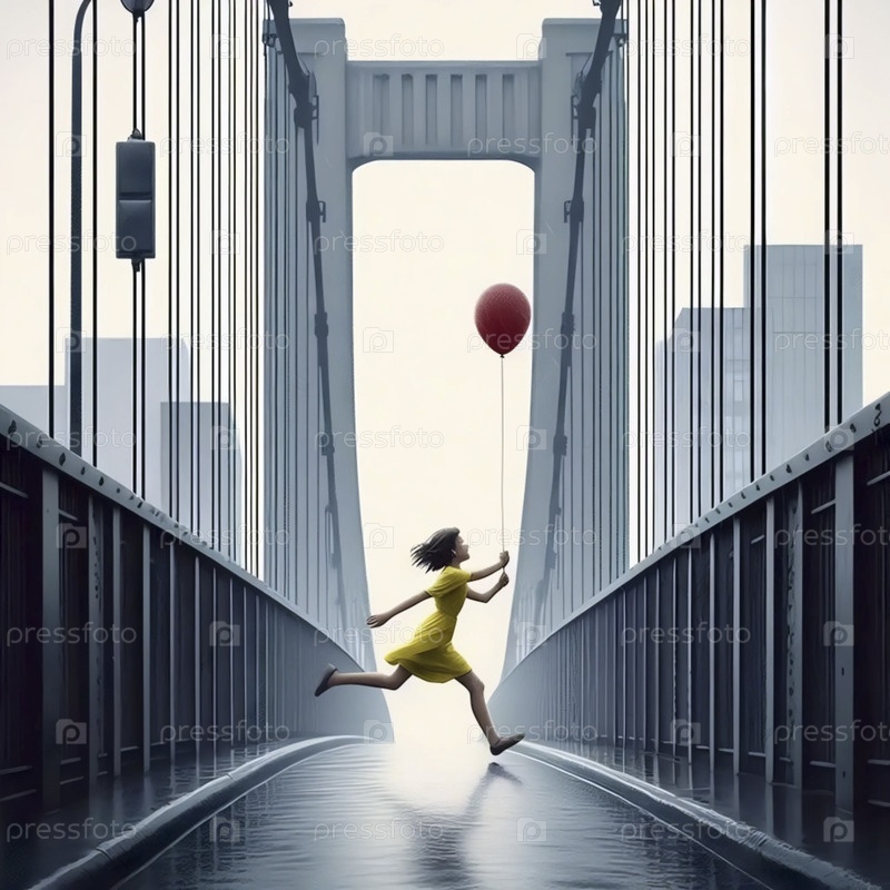 Девушка преследует потерянный воздушный шар над стилизованным городским мостом, Ai generated image