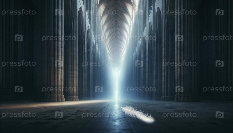 Одно перо, подвешенное от луча света в темном соборе, Ai создало изображение