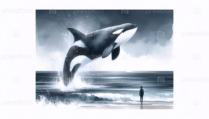 Печатная акварельная печать кита-орки и ребенка, Ai generated image