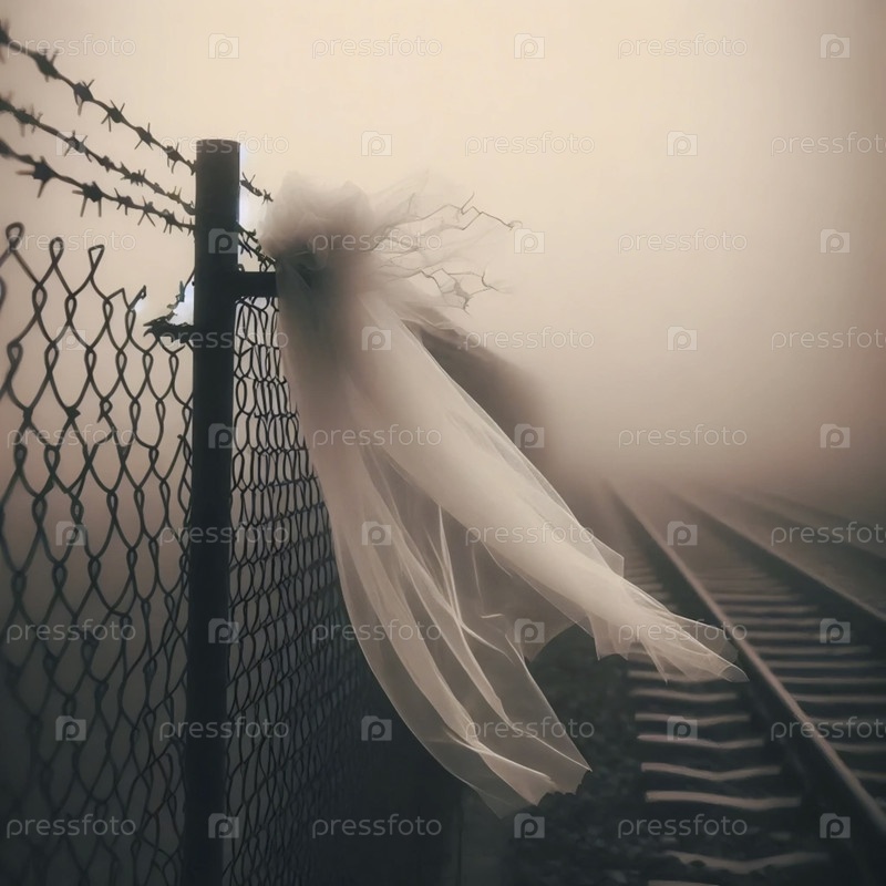 Свадебный платок, застрявший на заборе с цепными звеньями, Ai generated image