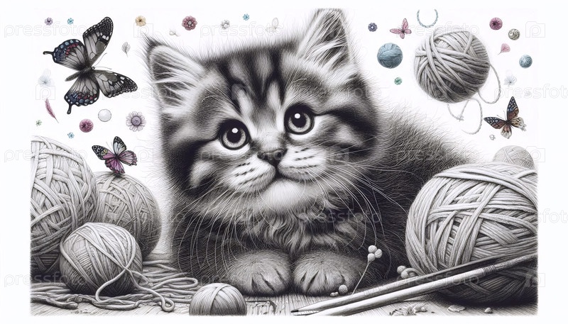 A playful kitten ink drawing art print, Ai generated image Играющийся котенок чернила рисует художественную печать, Ай создал изображение