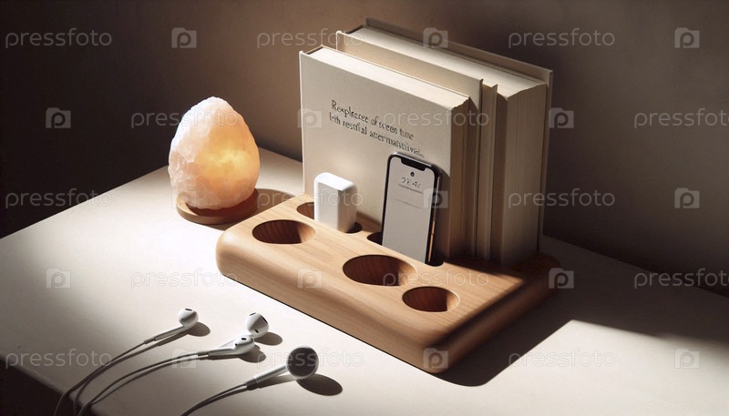 Минималистский деревянный макет зарядной док с пустыми слотами для нескольких устройств, на ночном столе рядом с бумажной книгой, Ai generated image