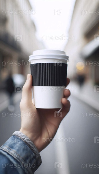 Стандартный макет чашки с кофе из белой бумаги с черным рукавом, удерживаемой в руке на городском фоне, Ai создал изображение