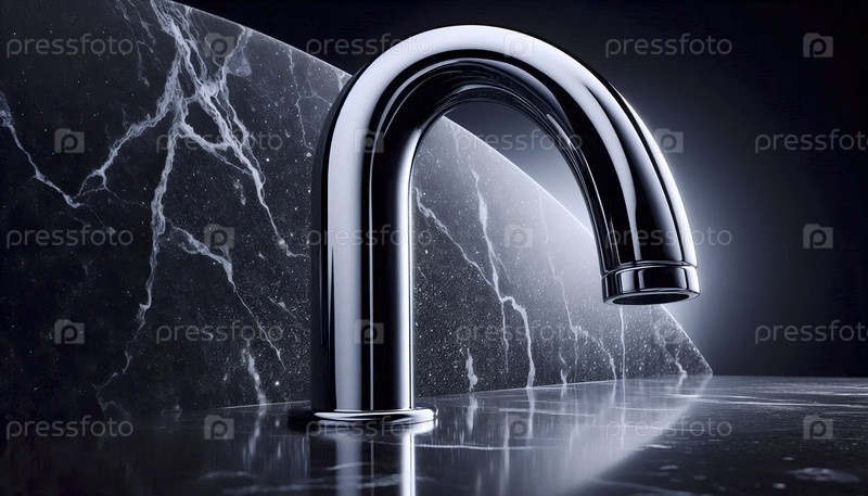 Мокет полированного хромированного крана на фоне абсолютного черного гранита, Ai generated image