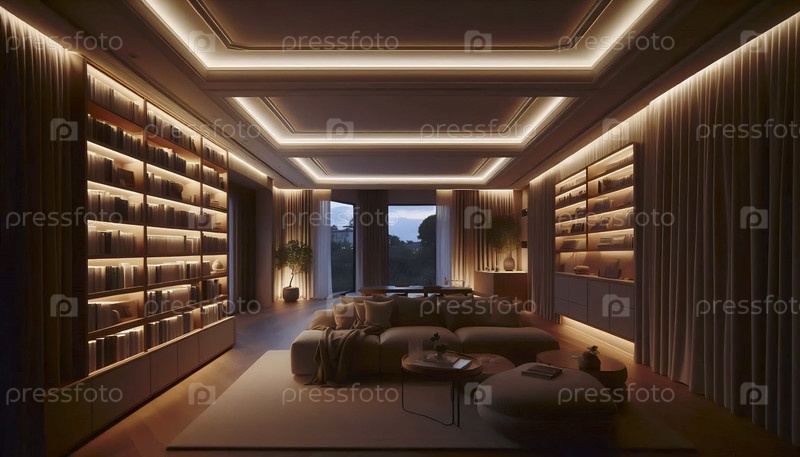 Минималистическая гостиная с интегрированным умным освещением, Ai generated image