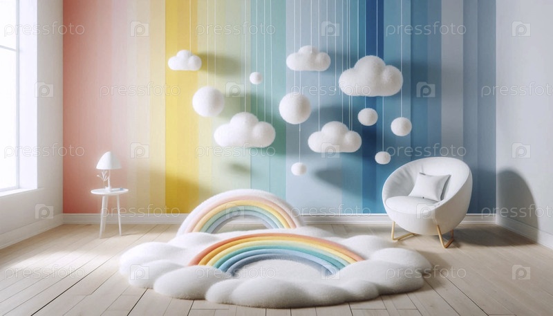 Игровая стена на тему радуги с висящими облаками ткани и пушистым ковром в форме облака, Ai создала изображение