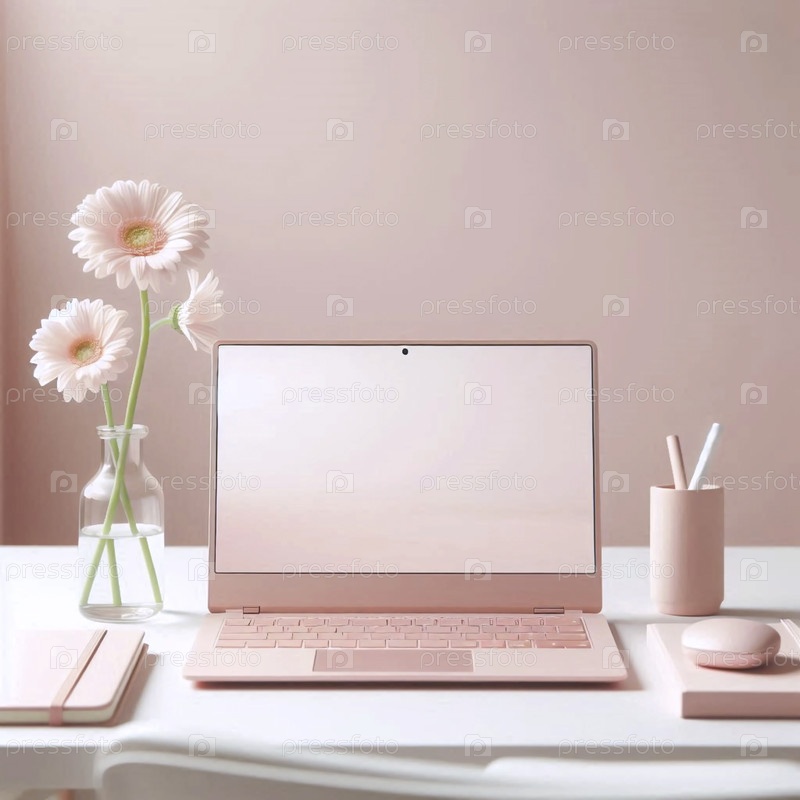 Минималистическое рабочее пространство с пастельно-розовым ноутбуком, одной ромашкой в стакане и изящным блокнотом, Ai generated image