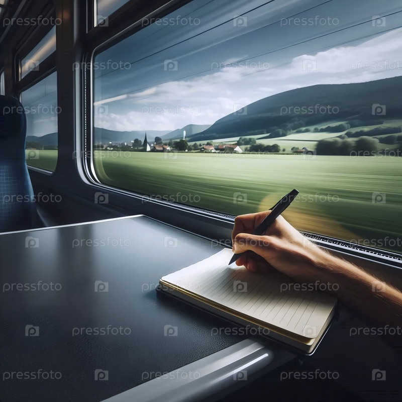 Одинокий писатель находит вдохновение во время поездки на поезде, записывая свои мысли в блокноте против размытого пейзажа, Ai generated image