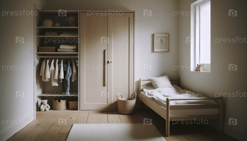 Низкая кровать вдохновлена Монтессори и доступный гардероб, поощряющий независимость ребенка, Ai generated image