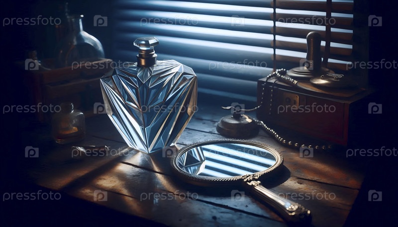 Мокет бутылки, вдохновленный искусством деко, опирающийся на запятнавшееся серебряное ручное зеркало на тщеславии, Ai generated image