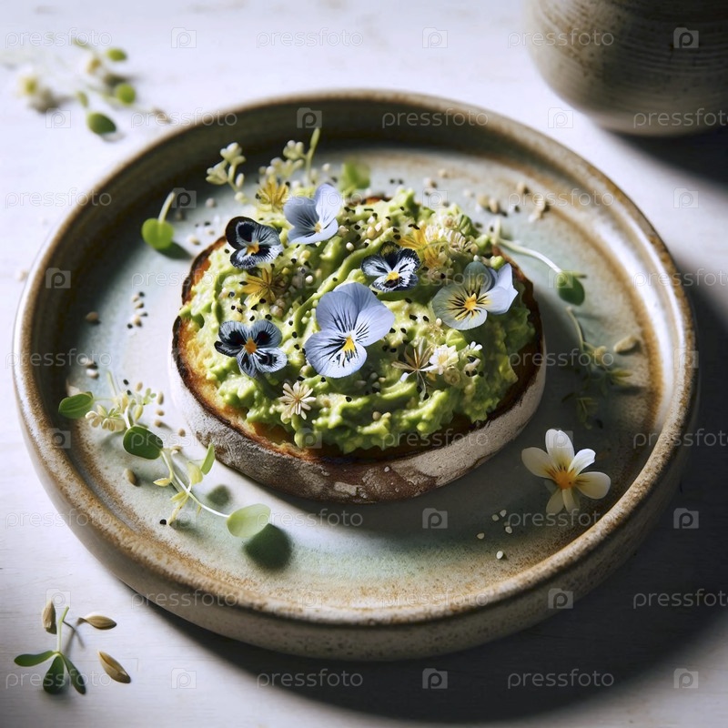 Небольшой круглый тост из авокадо с съедобными цветами и семенами кунжута на ручной керамической тарелке, Ai generated image