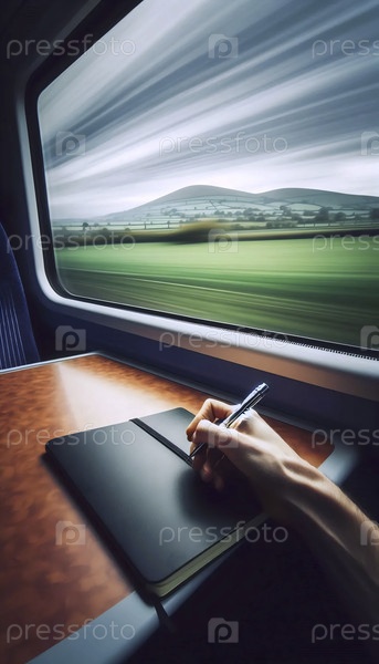 Одинокий писатель находит вдохновение во время поездки на поезде, записывая свои мысли в блокноте против размытого пейзажа, Ai generated image