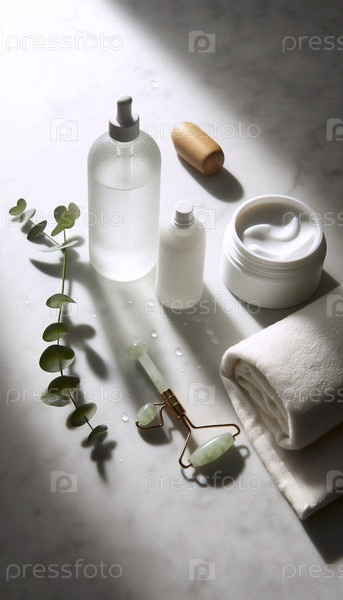 Спокойный утренний ритуал ухода за кожей с естественным светом и минималистическими продуктами, Ai generated image