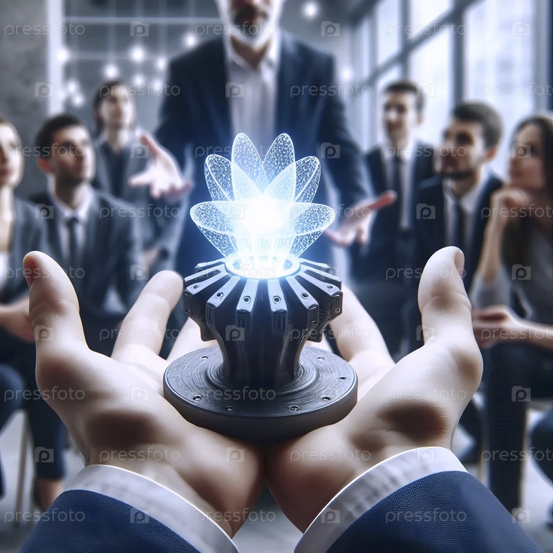 Динамическая стартап-сессия: руки, страстно жестикулирующие над светящимся прототипом на столе, Ai generated image