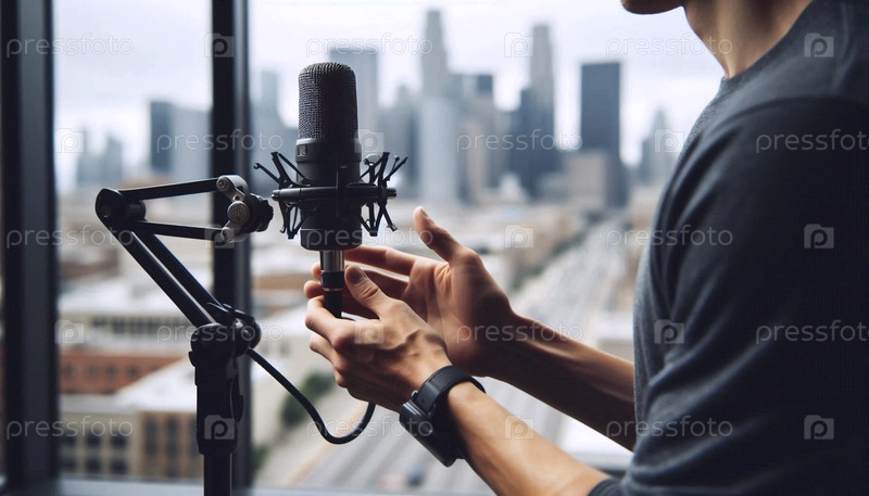 Решительный профессионал готовится к видеозвонку, настраивая высококачественный микрофон с городским пейзажем позади них, Ai generated image