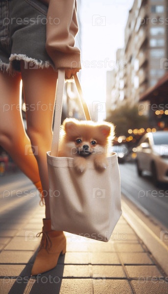 Игровой снимок маленькой собаки, заглядывающей из стильного полотенца на городскую улицу, Ai generated image