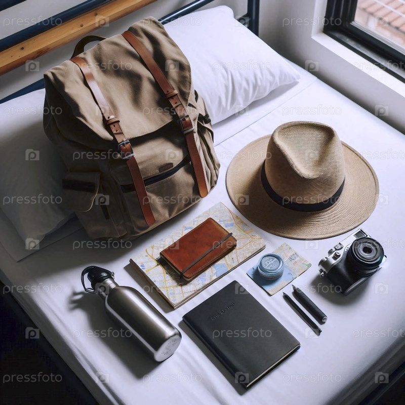 Необходимое оборудование для туристов, выложенное на кровать в общежитии перед днем исследования: карта, шляпа, журнал, бутылка с водой, изображение AI