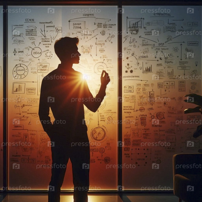 Вдумчивый лидер разрабатывает стратегию, в то время как пишет на стеклянной стене, заполненной схемами и целями