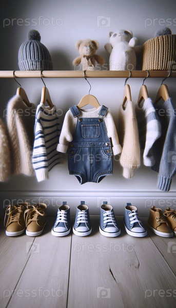 Милый, организованный шкаф с крошечной одеждой на миниатюрных вешальниках и маленькой обувью, выстроенной ниже, Ai generated image